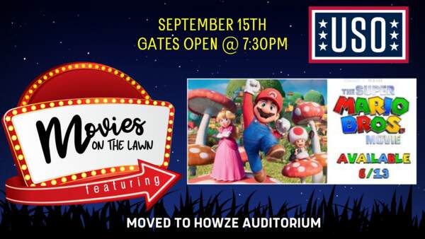 Event moved to Howze Auditorium! Due to the weather, The Super Mario Bros. Movie has been moved to Howze Auditorium. Doors will now open at 7:30PM! We are very excited to invite you and your family to join us for our USO: Movies on the Lawn where we will be showing The Super Mario Bros. Movie!