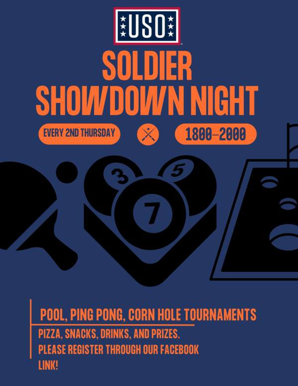 USO Fort Cavazos is hosting a Soldier Showdown Night for all active-duty service members! Bring your best attitude and prepare to be amazed by the competition you may see! Will you take home the title of the night, or will you be crushed by your fellow battle buddies? Not only will we have pool, ping-pong, and cornhole tournaments, but we will also host board game tournaments including Dungeons and Dragons, etc.