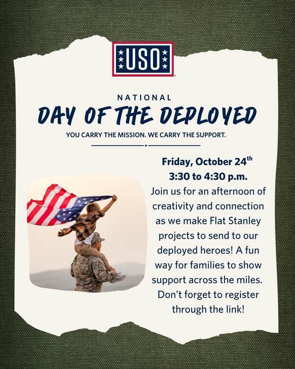 Join us for an afternoon of creativity and connection as we make Flat Stanley projects to send to our deployed heroes! A fun way for families to show support across the miles.