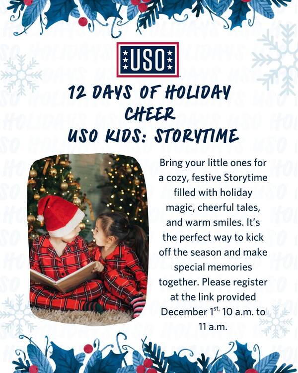 Join us every Monday for USO Kids: Storytime! Bring your little ones for a magical hour of fun, imagination, and adventure as we explore exciting stories together. 10:00 -11:00 a.m.