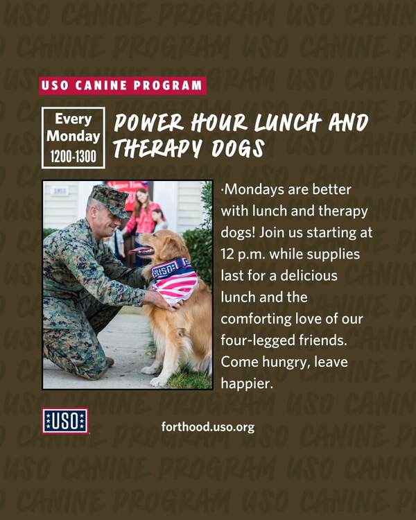 Mondays are better with lunch and therapy dogs! Join us starting at 12 p.m. while supplies last for a delicious lunch and the comforting love of our four-legged friends. Come hungry, leave happier.