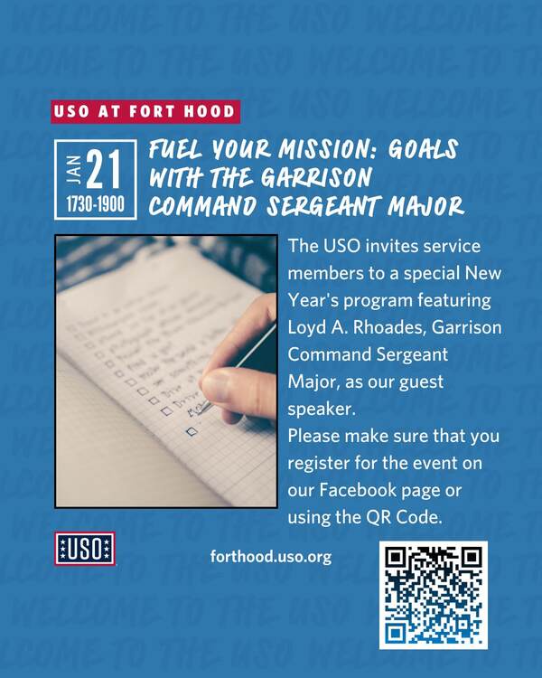 The USO invites service members to a special New Year’s program featuring Loyd A. Rhoades, Garrison Command Sergeant Major, as our guest speaker.