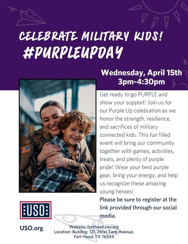 Get ready to go PURPLE and show your support! Join us for our Purple Up celebration as we honor the strength, resilience, and sacrifices of military connected kids.