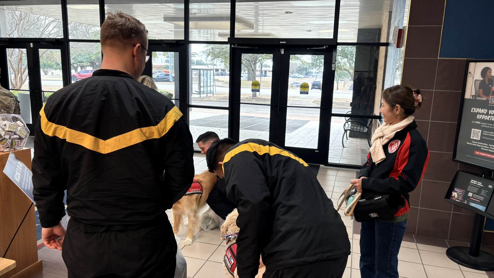 One soldier knelt down and wrapped Pearl in a hug, sharing that he has three Golden Retrievers back home. Seeing Pearl brought him immediate comfort and made his entire week, offering a familiar sense of home during a time when he deeply missed his own dogs. The other soldiers were just as thrilled, taking turns giving pets, soaking up the cuddles, and enjoying a moment of pure joy. Moments like these are a powerful reminder of the impact our volunteers, both two-legged and four, have on our service members. Sometimes, all it takes is a wagging tail and a little unconditional love to make a hard day brighter